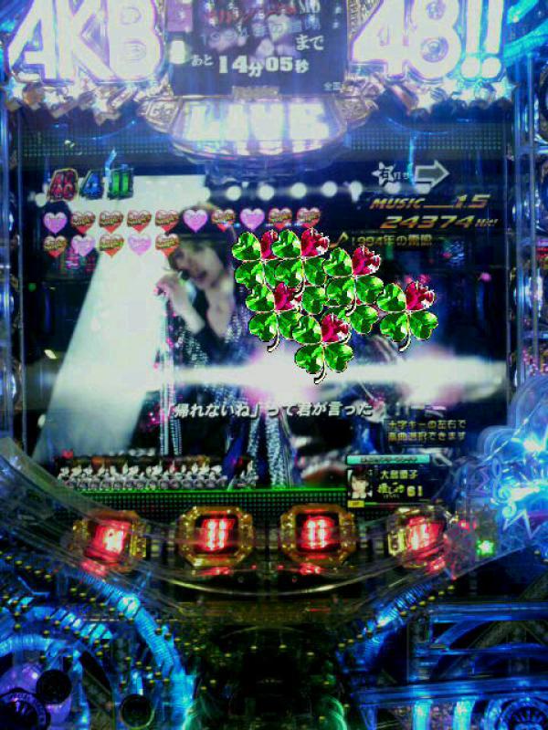 こんちぱ いつも見てくださる方 あたたかい拍手 ありがとうございます m(_ _)m 今日も行けたら スロバジリスク 打とうかな って思ってたら ふっと AKB48の 重力シンパシー公演 『1994年の雷鳴』 まだ聴いてなかったなぁ… って 今日までやん ってなわけで AKB 打ちに 行って参りました まずは 駐車場の見廻り 活動をしてから 内へ AKB 倍に増えてました ちらほらが 3周ほど見て廻り 打つ台を絞り込み 50回転ほどでヒット 4連チャン 一箱ノマレかけに単発 またまた 一箱ノマレかけに単発 伸びないなぁ… 移動かなぁ でも回るんだよね 上皿の玉で アンコールモード20回転 回せるほど で… 一箱入れたところで 玉ちゃん 一瞬玉ちゃん 見えたと思ってたら SSS当たり そこから