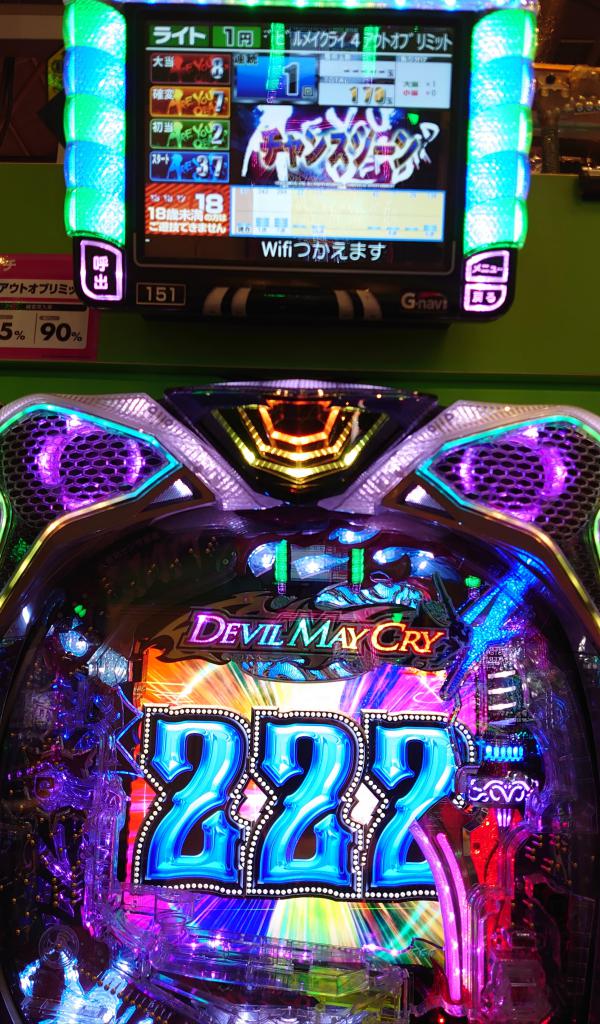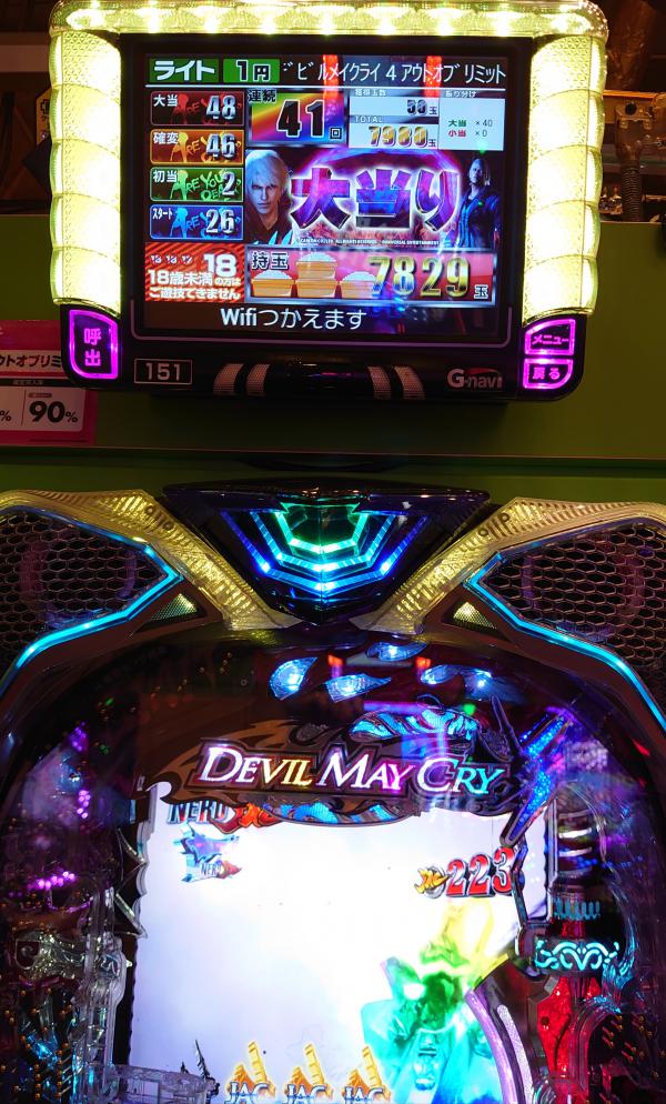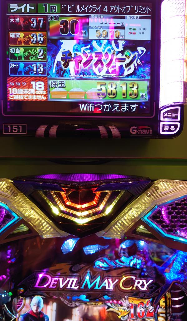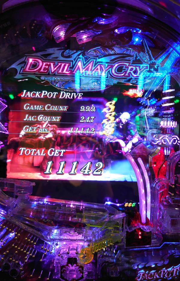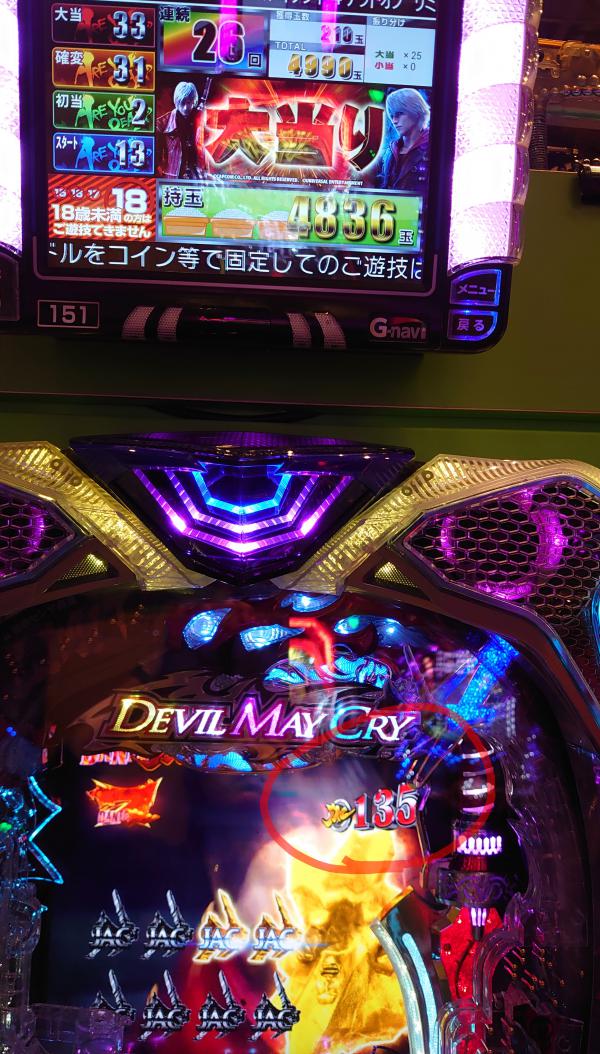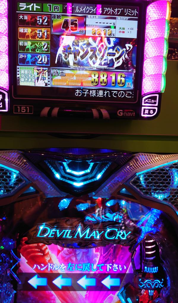 しかし・・・外す∑( ̄Д ̄;) またかよ(¬、¬) しばらく打つもフェイク3回・・・ダメだな。 バイオ並びで打つか悩んだけど当たり引ける気しないからホール徘徊テクテクトコトコ・・・ ん〜?デビルメイクライ? スペック見ると128をひいて100時短の突破型。 突破すれば10%の通常ひくまで1/25で当たり続けるとな こりゃ楽しそうだわ(o^^o) ↑ 当てて突破する気でいる幸せなアタシ(*´∇`*) 投資0.4Kで何か騒がしい・・・トリセツ見てたからよくわからない(笑) なんかAランクのリーチ? 赤保留にはなったけど・・・128だしね・・・最後ボタンが赤い 当たり♪ しかし・・・勝負はここからp(≧v≦)q とりあえず一旦トイレとトドちゃんに報告。 さぁ右打ち開始〜 38回転目になんかコイン3枚集めて最終ボタンがデカい!