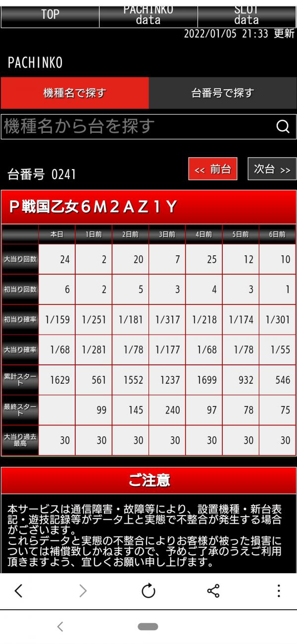 戦国乙女が状況良かったから気になりデータ見ると前日99止め……遊タイムまでは遠いけどそんなもん狙ってちゃダメだろ?って(笑)