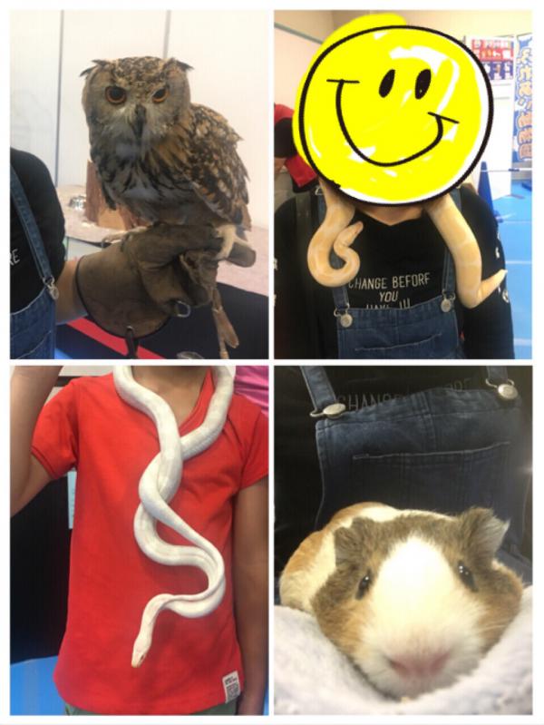 フクロウ腕にとまらせたり ヘビ首に巻いたり(^_^;) モルモット膝乗せたり〜