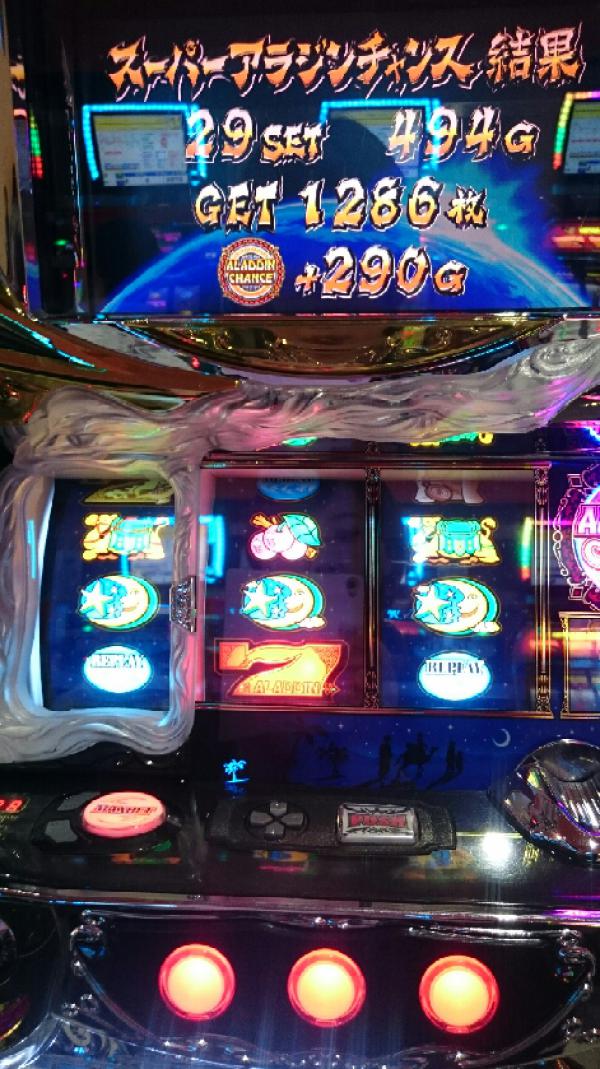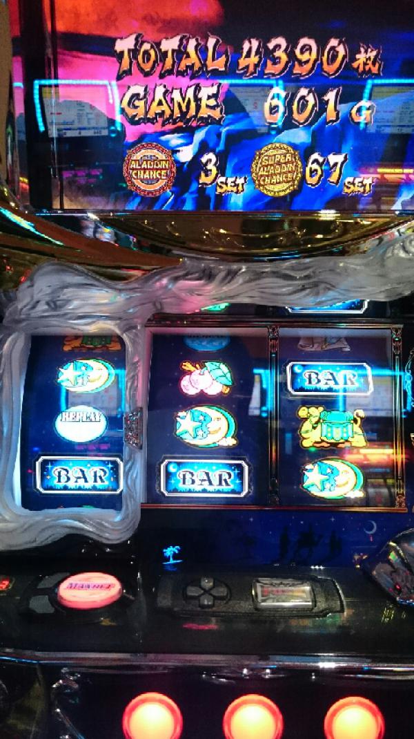 (・∀・)こんばんは〜 連休前の2連休目でした 今日は完全にお休みモード、体がだるくて重いので掃除したりうだうだしたりでした 昨日は、寝不足なのに10時位に自転車でホールへ たまにしか行かなくなったホールなので、狙いなどなくデータ見て回ってとりあえず回ってない、バジリスク絆へ。 2k入れてこれはないなと、やめて残ったメダルを近くのアラジンAⅡへ データ見て回った時、ちょっと気になってたのね 連日下がってるから、どうだろとね 期待してなかったら、リールががっくんした (・∀・)…前日リセットかけるようなゲーム数でもないのにがっくんしたね、うん。 ちょっと打ってみるかなと回すと、追加1kでチェリ連から単チェリーで試練の塔経由、炎まで行って次回予告でアラジンチャンス★゜☆。+。゜ おお、今日はあっさり行った まぁ、駆け抜けるよねと黙々と回す 強チャンス目からボーナス(・∀・)♪ うっしゃー!やれる日かも