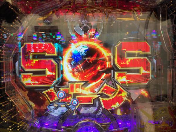 実戦開始から49回転目。 入賞時フラッシュ(白)+兄弟チャンス目(赤)からSOSゾーンに突入。