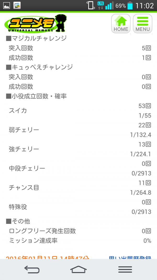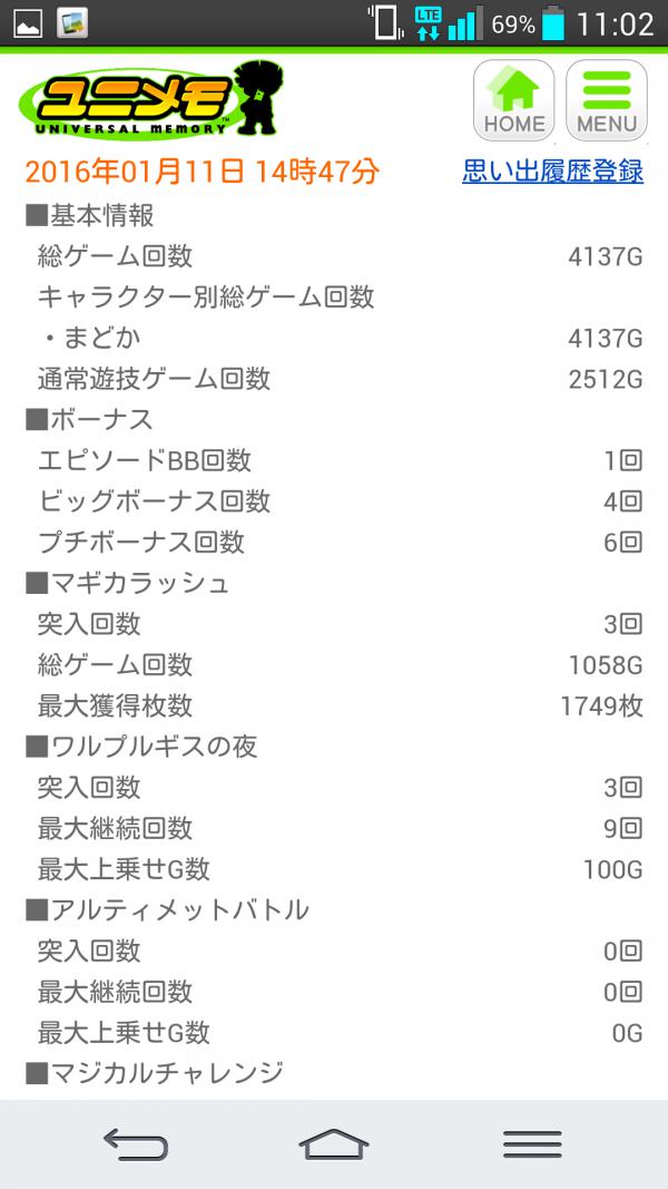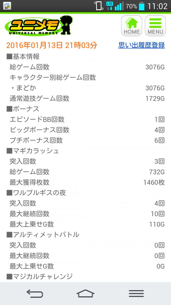 結果は-16k 違うホール見に行って帰りお好み焼き買って帰りました! 1/13は仕事終わり17:00からホールへ 流れは ハマル ↓ 1000枚出る ↓ 少しハマル ↓ 穢れさやかEP400枚 ↓ ハマル ↓ 1400枚出る ↓ ヤメ っな感じでミラクル無し(T▽T) ユニメモデータは↓