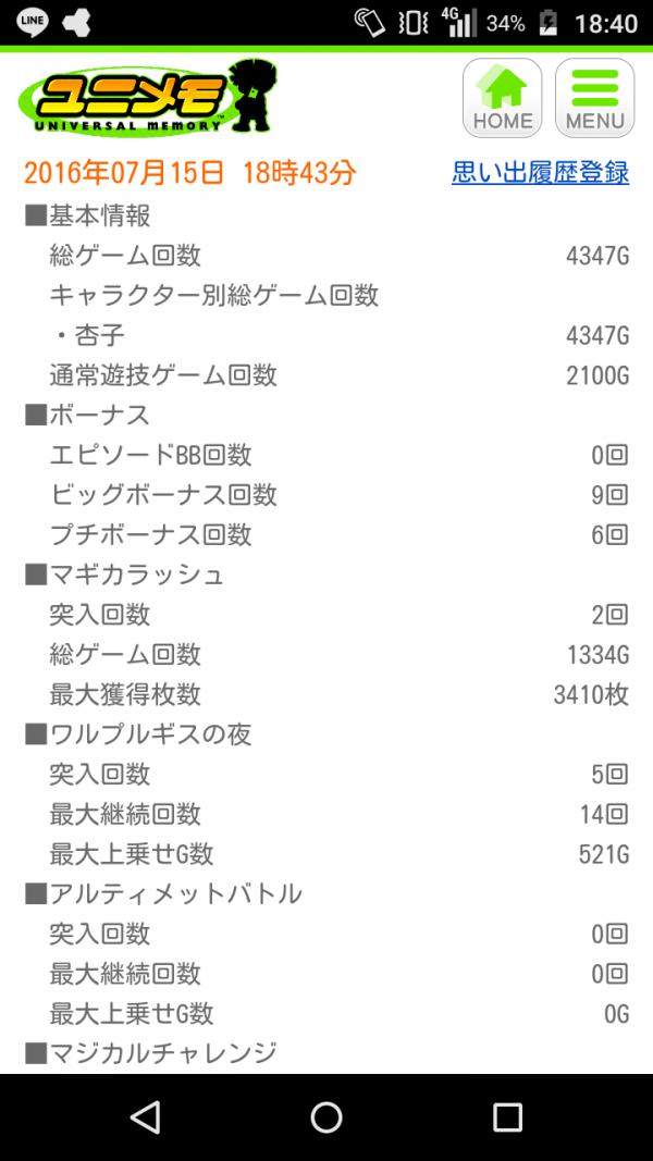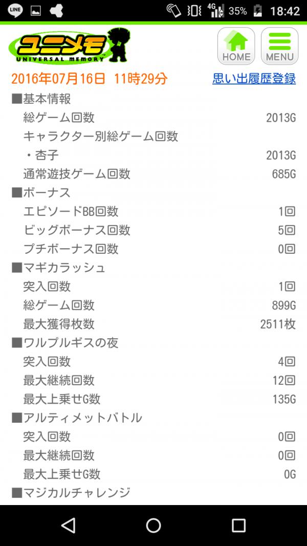 確か+15~20Kくらいはあったような・・・ (また確かでごめんなさい) 7/16土曜日 朝一からホールへ 投資3KでBIG+ARTGET! それが展開が良く2500枚! その後ユニメモキャラあんこ→ほむらに変更 ここまでのユニメモデータは↓です