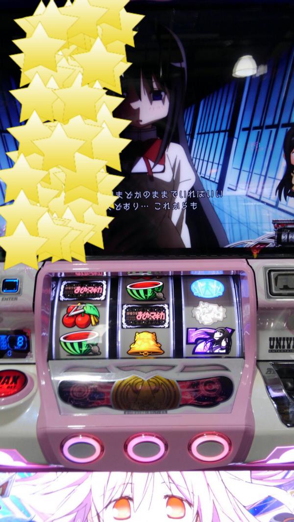 まどマギ2中チェ3(  ̄▽ ̄) こっちガン見してる店員さん写ったから加工w 中チェ4 写メ無いですが 鹿目家でまどかとママが歯磨きする演出で中チェ引いたんですが 中チェだなんて思って無く適当打ちで中チェ外しました(´・ω・`)BIG中斜め揃い(  ̄▽ ̄) んで最後にロンフリ(  ̄▽ ̄) こんな感じで生きてはいます(  ̄▽ ̄) またなんかありましたらサボらんよう投稿したいっすね! 写メだけでしたが最後までアリガトでした(・∀・)ノ