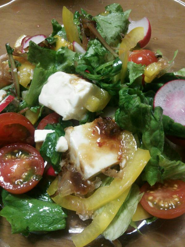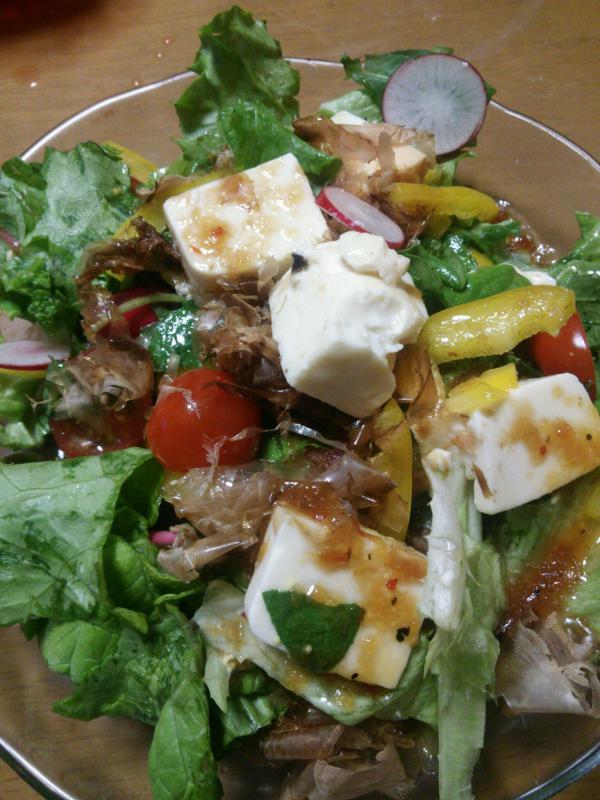 豆腐サラダ♪激盛り レタス♪ラディッシュ♪トマト♪黄色ピーマン 絹ごし豆腐♪カツオ節