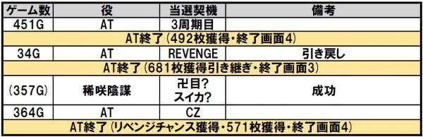 AT終了後、34GでREVENGEが発生してATを引き戻し!ようやく引けたよ。さらに、設定差が大きいと言われているCZ「稀咲陰謀」も確認できました。