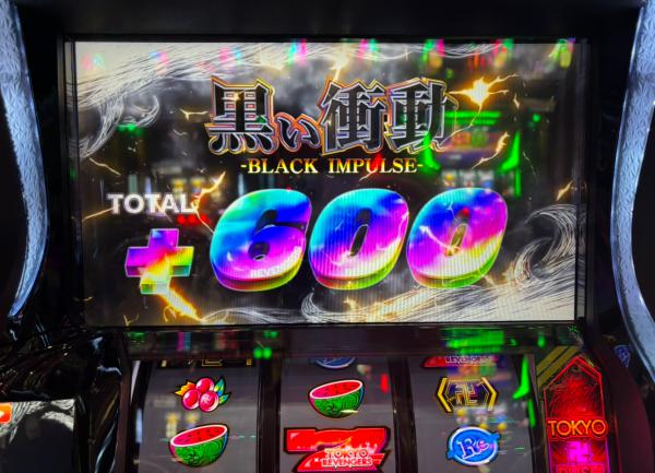 黒い衝動じゃい!!黒い衝動は5G継続するSTタイプで、消化中に上乗せ発生でSTゲーム数が再セットされます。成立役に応じて差枚数上乗せ抽選が行われ、上乗せ時は100枚以上。