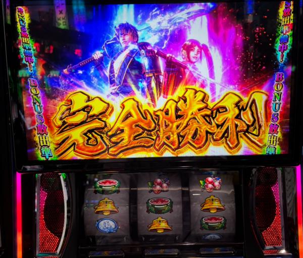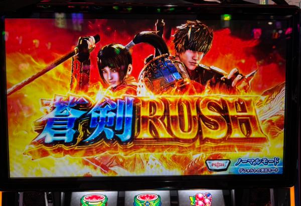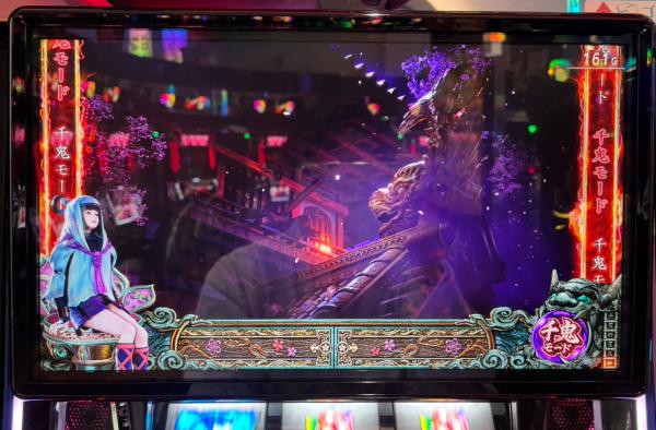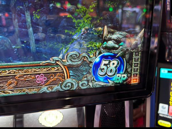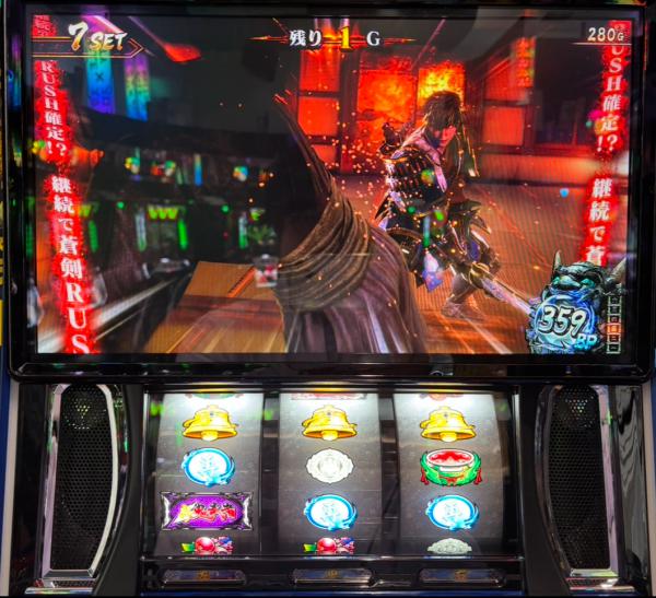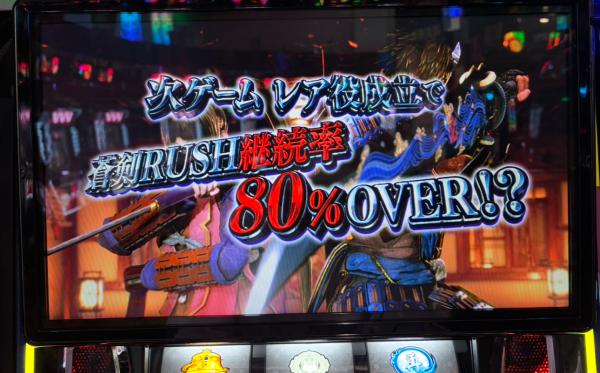 まずは簡単にゲーム性を紹介。AT当選契機は複数ありますが、メインは規定周期到達です。バッサリポイント(以下、BP)を貯めていき、規定BP到達で1周期消化となり、前兆ステージ「鬼モード」に突入します。規定BPは111pt~666pt(111pt刻み)。 通常時に関しては、「スマスロ モンスターハンターライズ(以下、モンハンライズ)」をイメージしてもらえればと。 継続率管理型AT「蒼剣RUSH」は純増約2.5枚/Gで、消化中はゲーム数上乗せ・セット継続・ボーナスを絡めながら出玉を増やしていく、おなじみのゲーム性。 打ち進めていくと1周期目はスルーし、2周期目を消化している最中に動きが。
