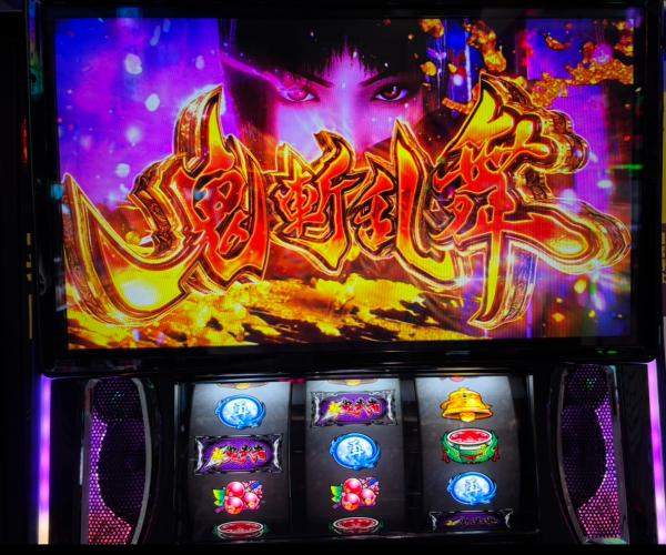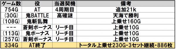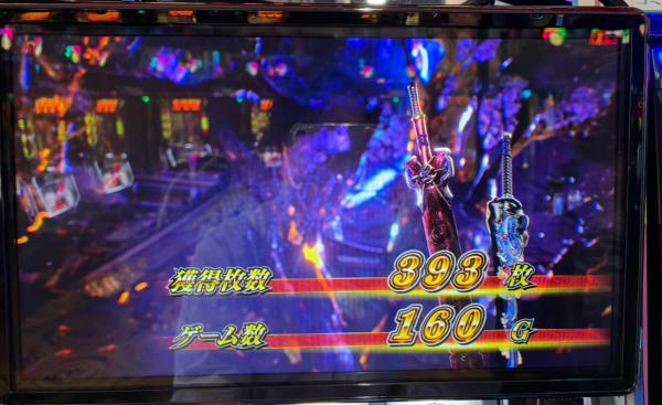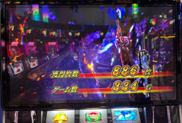 ボーナスを引いたり、上乗せ特化ゾーン「鬼斬乱舞」を引いたりして、900枚弱の出玉を獲得できました。