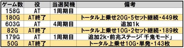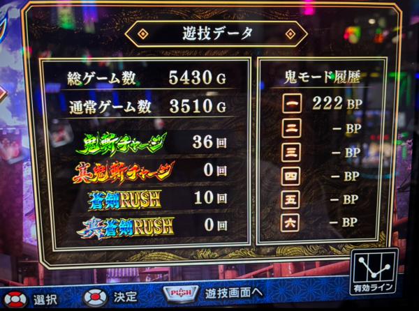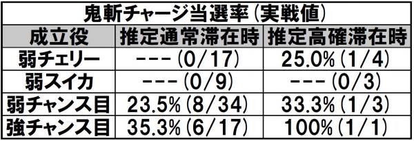▼結果 投資46.0k 回収26.0k 収支-20.0k 大負けは回避することができてよかったです。打った台の設定は下かと。気になったポイントをまとめてみました。 ●鬼斬チャージ当選率