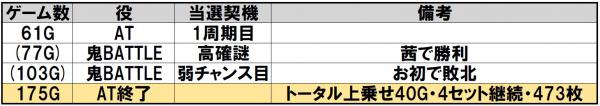 66%以上のAT濃厚となる千鬼モードに突入するも単発。66%なら3連はしてほしいところなんですけどね。チャンスはもらえているのに活かせていない自分が悪いっすわ。 次は…754G、4周期目でAT当選(追加21k)。これで総投資は46kです。結構膨らんでしまったため、ここいらでまとまった出玉を獲得したい!