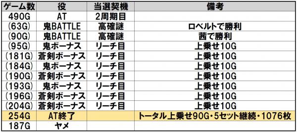 鬼斬チャージを7セット継続させることができました。ここからは、継続するほどATのゲーム数を上乗せしてくれる、ちょっとした上乗せ特化ゾーンです。