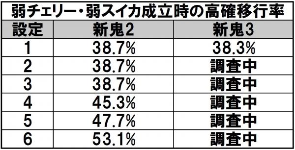 通常時のゲーム性は前述の通りモンハンライズに近いため、弱レア役からの鬼斬チャージ当選率に設定差があるのではと予想しています。 推定通常滞在時においては、弱チェリー・弱スイカからの鬼斬チャージ当選は確認できなかったため、当選すれば高設定の期待度がアップするかもしれません。モンハンライズでは弱レア役でまとめてカウントしていましたが、本機では別々にカウントした方が良さそうです。 ●弱チェリー・弱スイカ成立時の高確移行率 弱チェリー・弱スイカ成立時の高確移行率は設定1のみ判明しているのですが、実はこの数値、新鬼2の設定1とかなり近いんですよね。