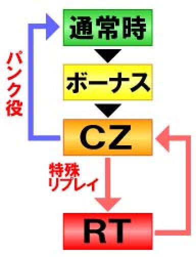 ボーナス終了後のチャンスゾーン(CZ)で特殊リプレイを引けばRTに突入、パンク役を引けば通常時に転落。さらにRT終了後は再びCZに突入、という非常にオーソドックスなタイプとなっているぞ。