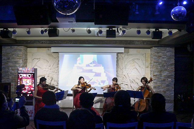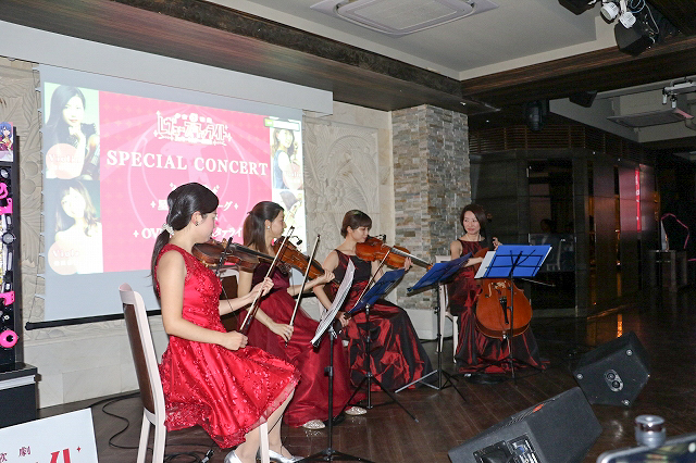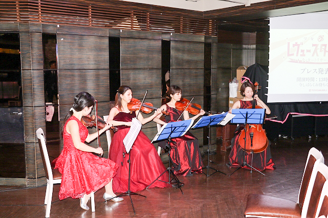会場では本作品の「歌劇」にちなみ、ヴァイオリン:志村葉月さん、神山里梨さん、ヴィオラ:柴田春音さん、チェロ:山崎明子さんによる生演奏にてメディア関係者を上品にお待ちかねしていた。