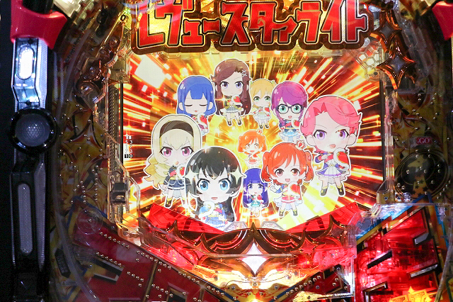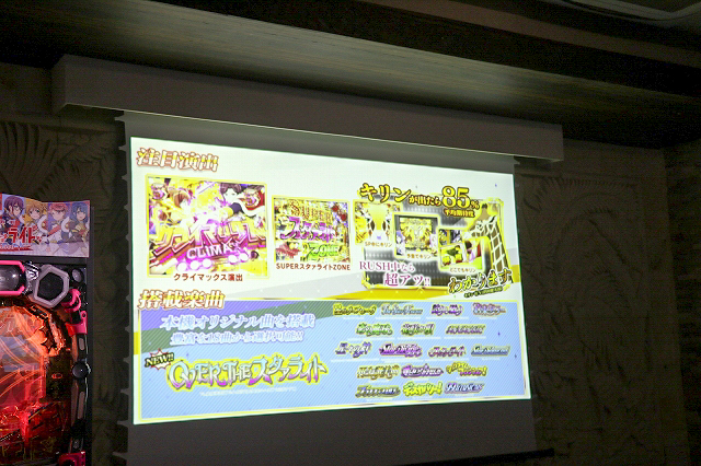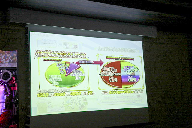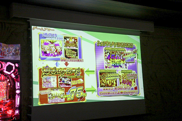 その後機種説明が行われた。本機は大当り確率1/199.8のライトミドルタイプでST100回+残保留4個の「トップスタァロード」突入率は50%、継続率は約75%でSTリセットなどは一切なしとなっている。ここで5%の追撃もしくは10%の追撃10倍ZONEに当選すると大チャンス!前者はラッキートリガー発動となり、4500個獲得確定となる上に、さらに1500個以上の上乗せが約52.5%で上乗せループしていく。10倍ZONEでは50%で追撃獲得、残りの50%で3000個獲得して追撃獲得チャンスへと移行する。追撃が終了すると再びRUSHに突入するのでさらなる追撃を狙っていこう。