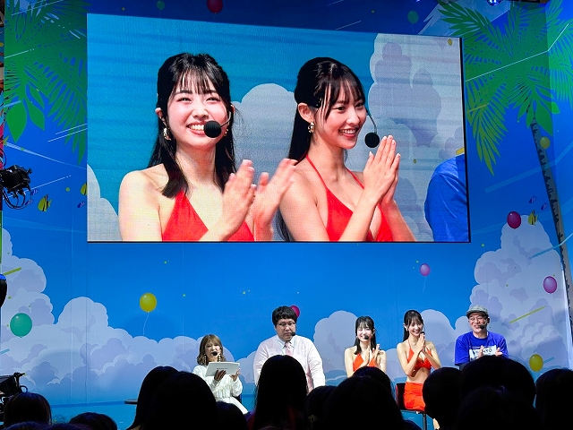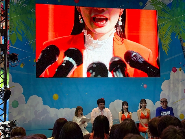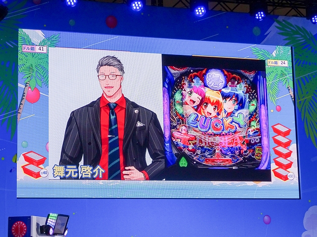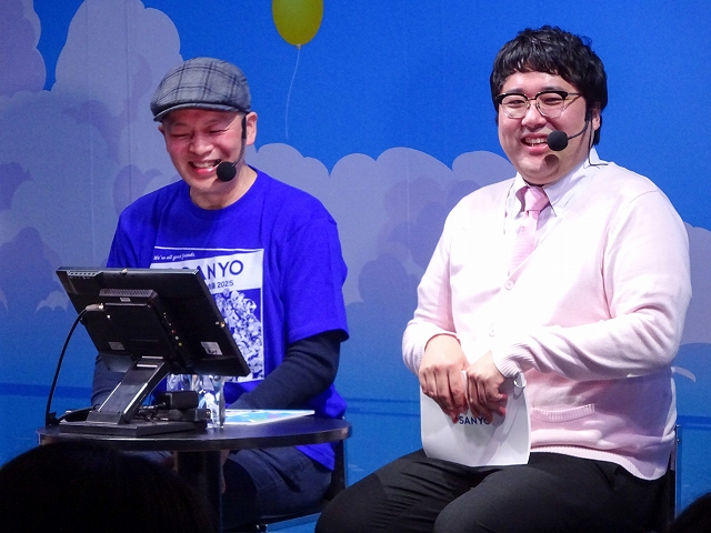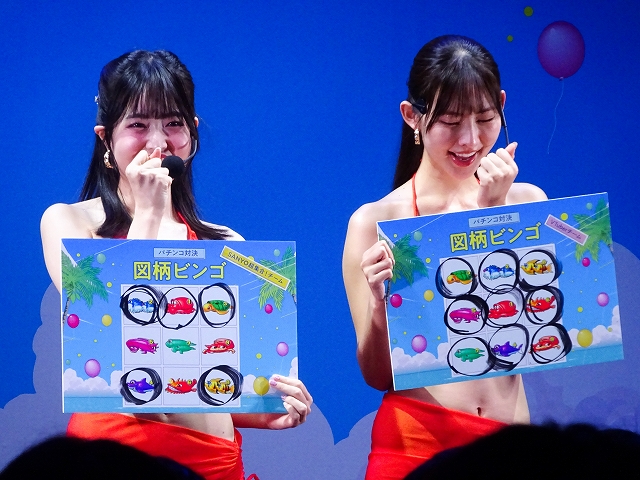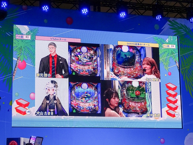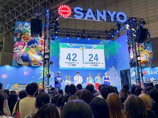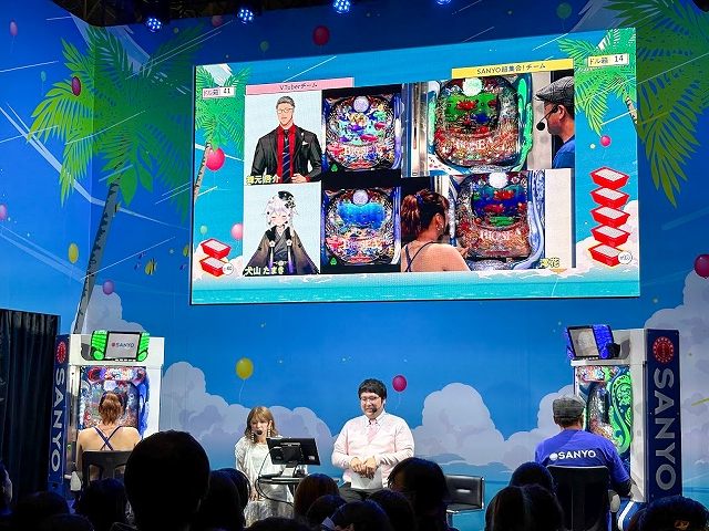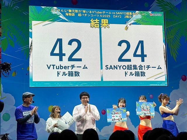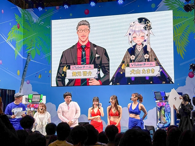 取材をしたDAY2ステージでは、MCの矢口真里さん、マヂカルラブリー・村上さん、10代目ミスマリンの賀村恵都さん、あのんさん、4代目ミスワリンの澪花さんらSANYOチームが人気VTuberの舞元啓介さん(にじさんじ)、犬山たまきさん(のりプロ)とパチンコで大当り数を競う対決企画「海物語 超パチンコバトル2025」。Live DJのYASUHIROさんによるスペシャルDJRemixLIVE、アイマリンのキャラクターボイスを担当する内田彩さんら声優陣によるトークショーが楽しめる「新章アイマリンプロジェクトステージ」や「SANYOからの超重大発表」ステージが行われていた。