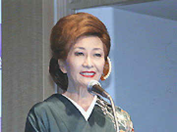 機種の世界観に合わせ、代表取締役 社長 佐藤英理子 氏も、着物で登場。「今回のパチスロは、万人受けする、稼働重視の機種として開発いたしました」