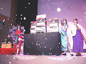 登場するキャラクターに扮するコスプレイヤーさんたちが舞台に上がる。登場時のセリフは、なんとオリジナルの声優さんによるもの!