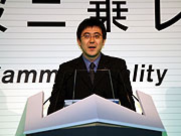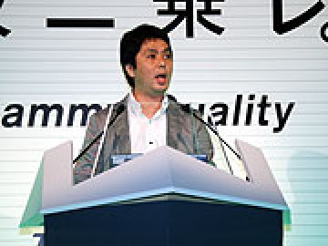 初めに、サミー株式会社 専務取締役 小口久雄 氏より挨拶などが行われた。「パチスロ交響詩篇エウレカセブンは、サミーの物作り精神を進化させ、4号機時代の期待性、演出を再現しました!」