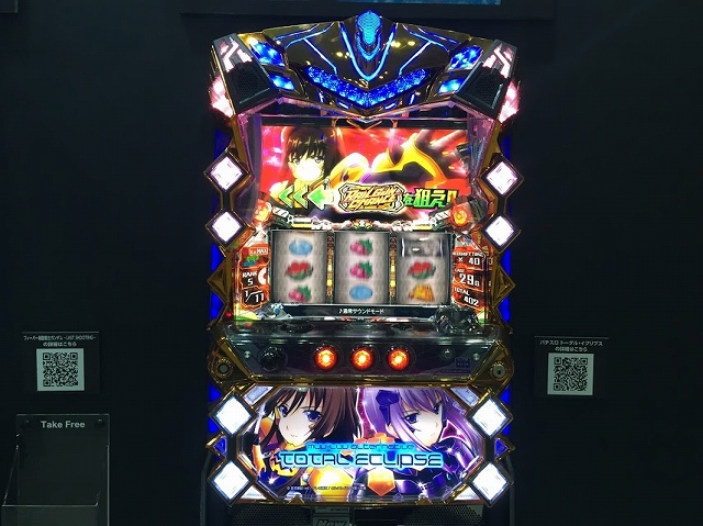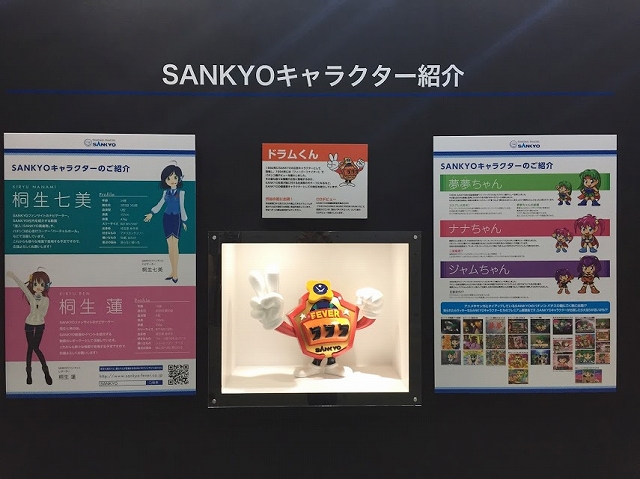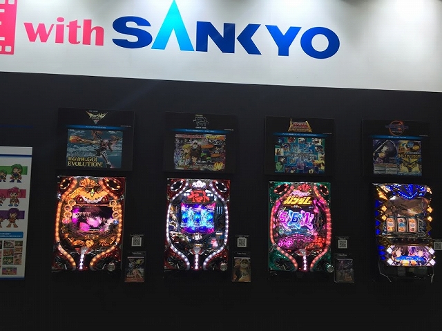 SANKYOのブースでは、最新機種「パチスロ トータル・イクリプス」の他、CRフィーバー機動戦士ガンダム-LAST SHOOTING-などの実機展示も行われていた。