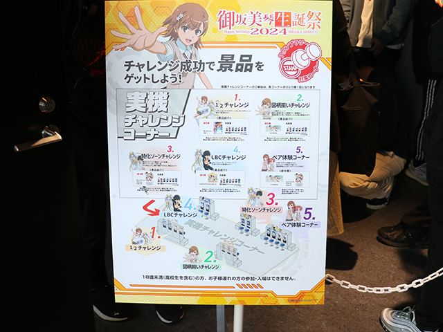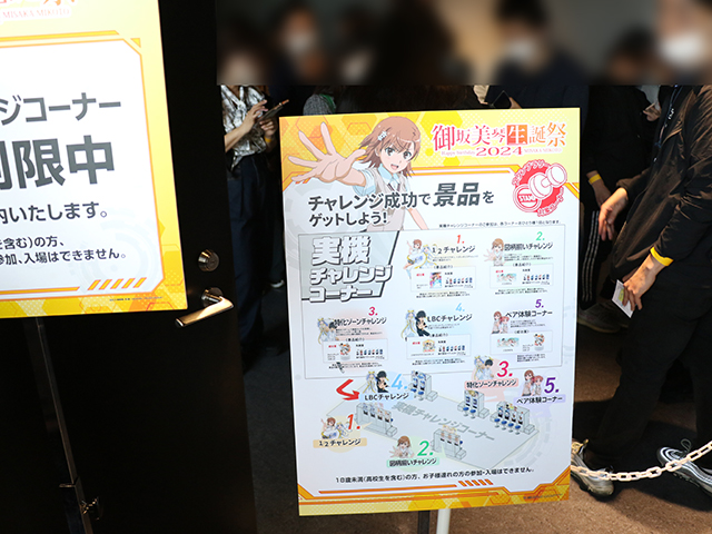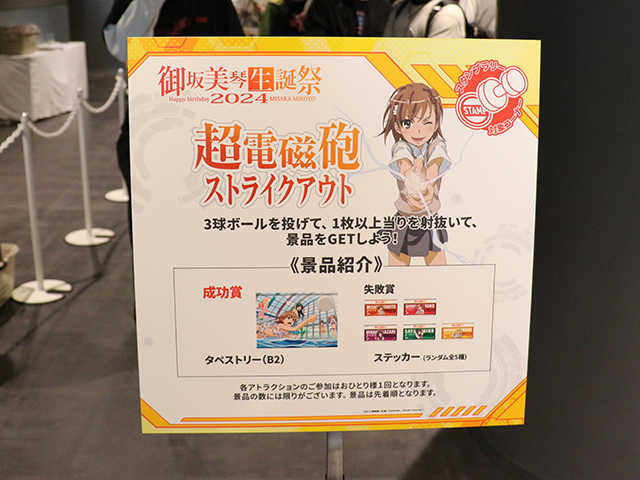 「妹達(シスターズ)のビリビリ棒」「学園都市レーザーミッション」「超電磁砲ストライクアウト」が用意されており、いずれもミッションクリアで特別な景品をゲットできるとあってこちらも長蛇の列が作られていた。
